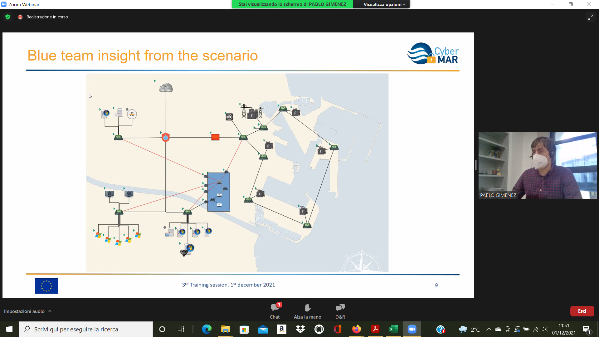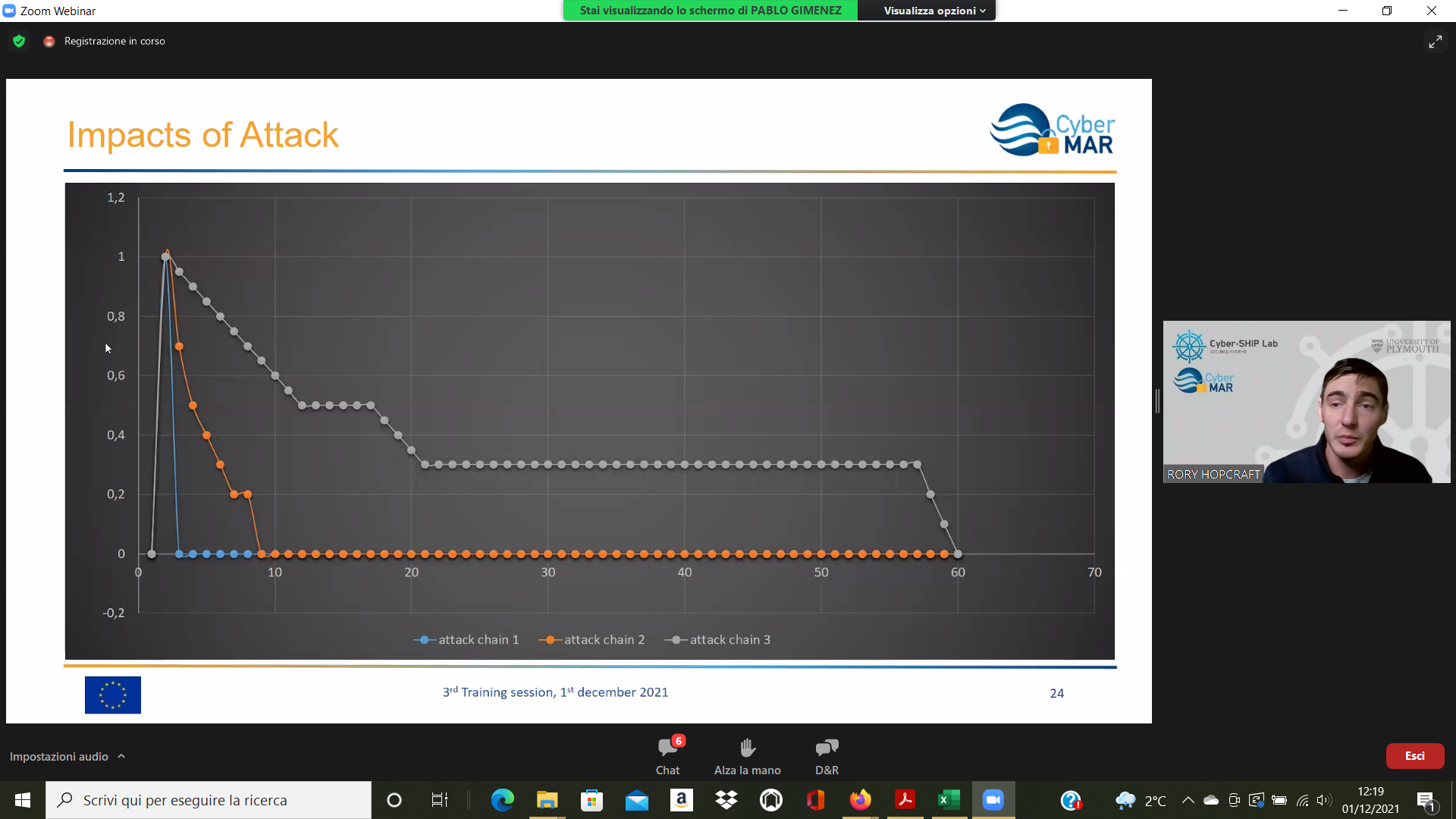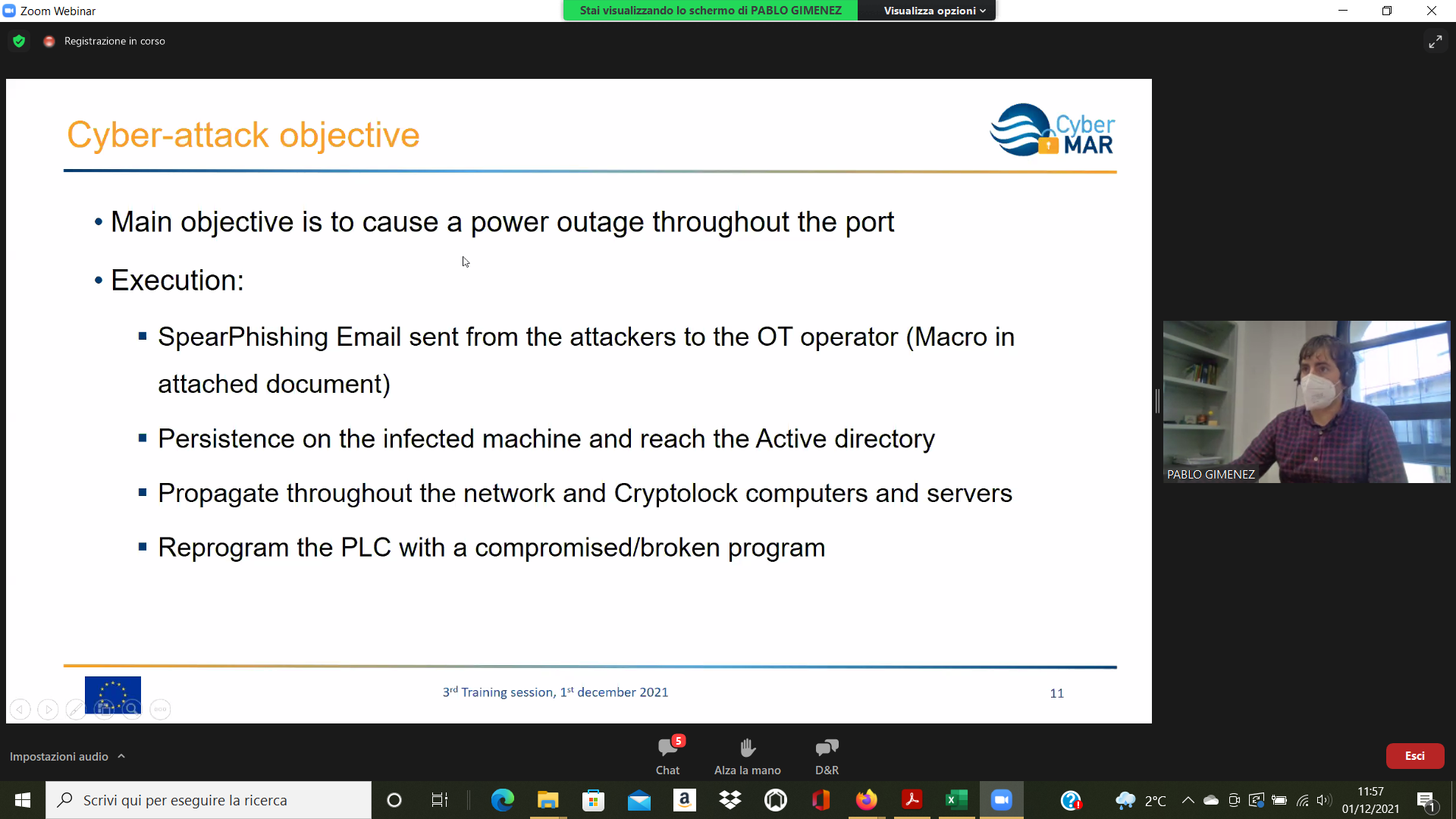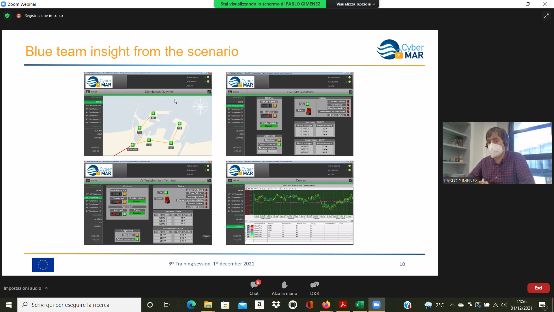 On the Second day – 1st of December, the Intermediate Levels of training, included two courses entitled: “Lesson learned from Cyber MAR pilots: Cyber-attack scenario on the Valencia port authority’s electrical grid” [I004]; and “Using a Cyber Range to Understand risk” [I003 – b], conducted successfully by the colleagues from WMU, VPF, UoP & AIR.