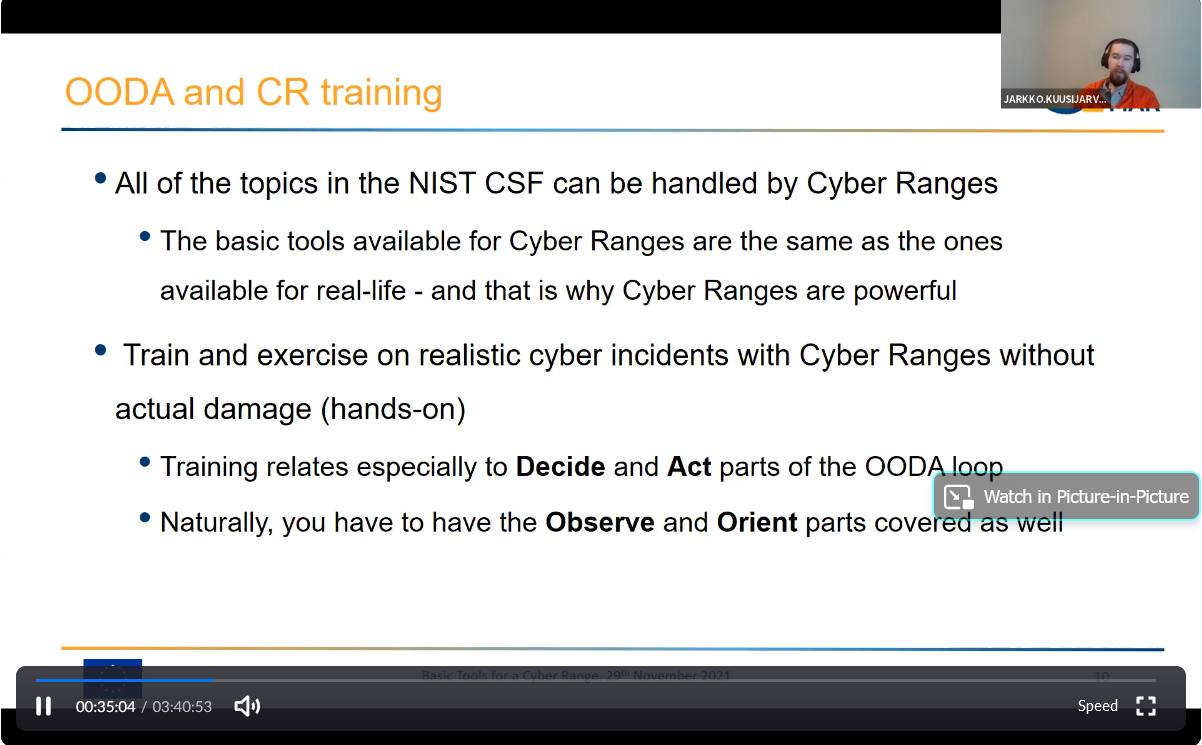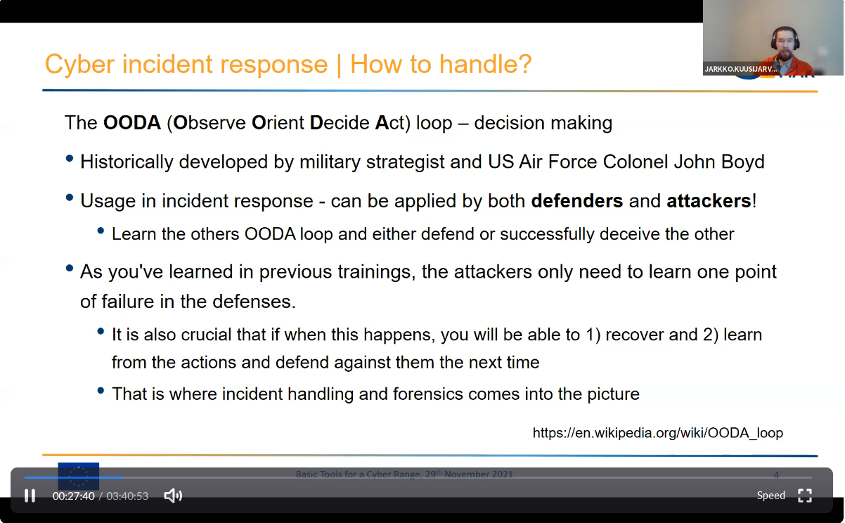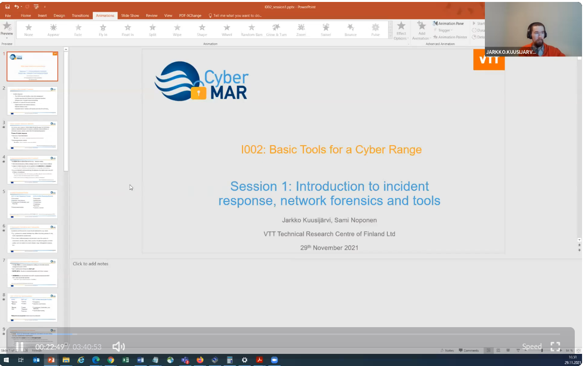 On the First day – 29th of November, the Intermediate Level of training, included one course entitled: “Basic Tools for a Cyber Range” [I002], conducted successfully by the colleagues from WMU, IMSSEA,VTT & ATOS.